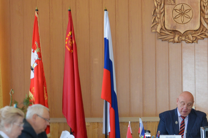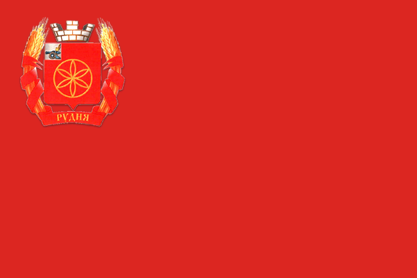 В Зале заседаний Руднинского округа среди прочих выставлен красный флаг с гербом Рудни вверху у древка.