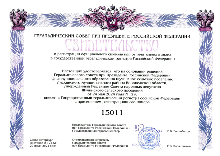 Флаг внесен в Государственный геральдический регистр РФ под № 15011.