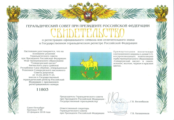 Флаг внесен в Государственный геральдический регистр РФ под № 11803.