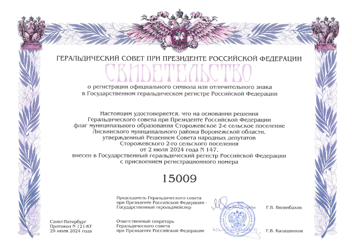 Флаг внесен в Государственный геральдический регистр РФ под № 15009.