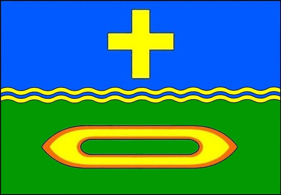 Полотнище разделено волнистым лазоревым поясом, окаймленным золотом. В верхней синей части золотой равноконечный (греческий) крест. В нижней