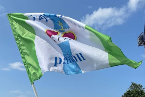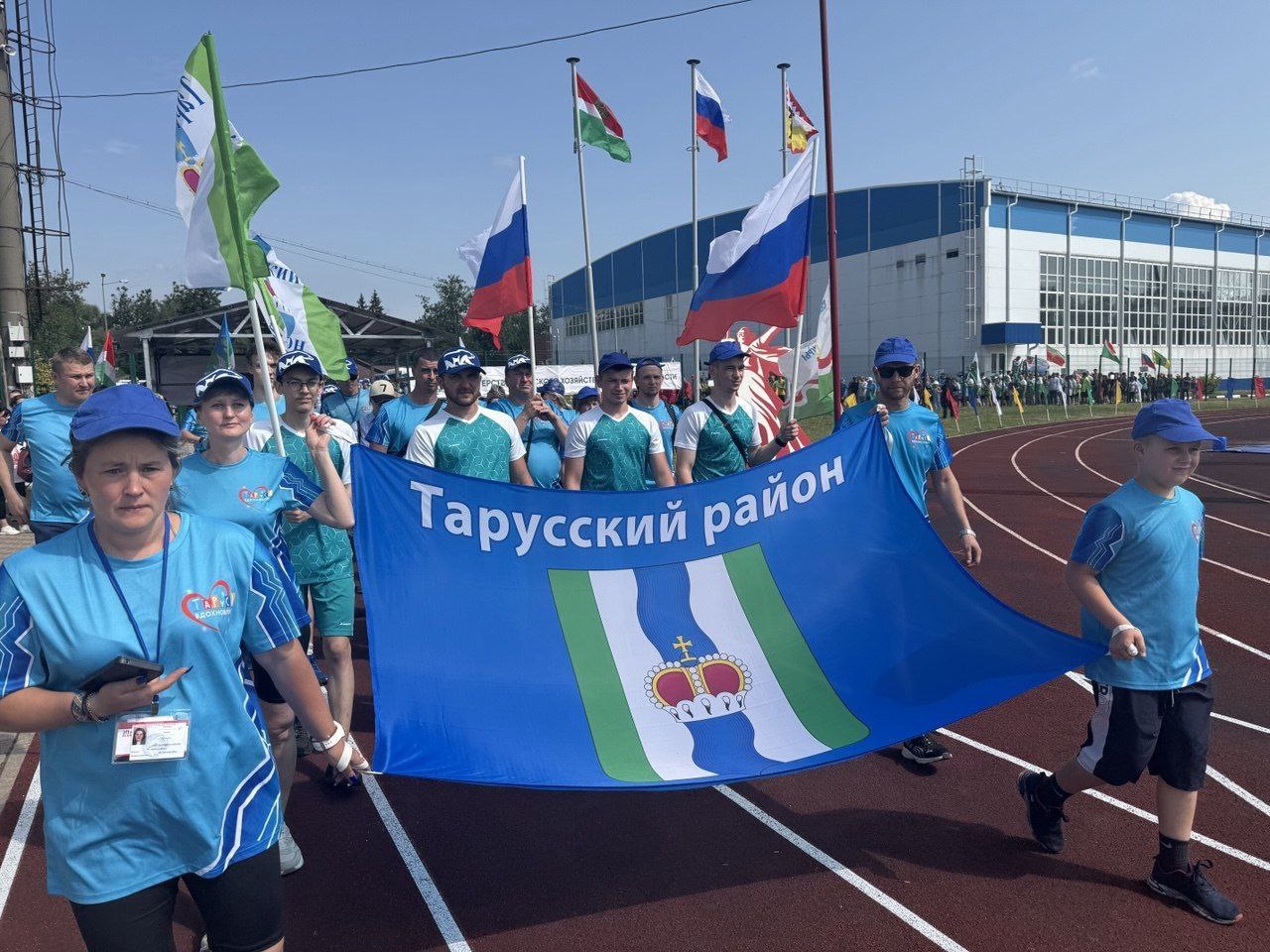 Спортсмены Тарусского района иногда используют флаги альтернативного дизайна. Например, синий флаг с гербом района (под ним команда Тарусского района выходила на открытие XXX областных летних сельских спортивных играх, 2025 г.). Или официальный флаг района, дополненный надписью "Тарусский район" (фото с тех же игр). Источник фото: дзен-канал "Это Голубев" |
