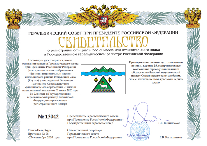 Герб и флаг Тянского национального наслега утверждены решением наслежного Совета депутатов от 01.06.2020 года № 2. Описание флага: "Прямоугольное полотнище с отношением ширины к длине 2:3, воспроизводящее композицию герба муниципального образования «Тянский национальный наслег» Олекминского района в белом, синем, зеленом, желтом, красном и черном цветах". Флаг внесен в Государственный геральдический регистр РФ под № 13042. Материалы геральдического архива В. Маркова. Фото свидетельства - официальный информационный портал Республики Саха |