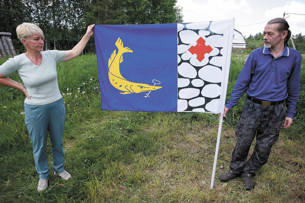Деревня Ундово имеет собственный флаг. "... использовано несколько цветов: червленое золото (красный) – это кровь, пролитая в борьбе, гордость, память, храбрость, мужество и зрелость; золото (желтый) – богатство и достаток; серебро (белый) – символ чистоты, надежности и духовных ценностей; лазурь (синий) – верность, великодушие, свобода; зелень – юность, радость, изобилие; черный – постоянство, мудрость, сцепление. ... На лазурном поле помещена золотая щука – олицетворение реки Сумы – с серебряным ключом в пасти, символом родника. Голова щуки повернута влево – по течению реки. Белое поле выполнено в виде ливонской кладки, сложенной из камней разной формы, с черной муровкой. На ней изображен червленый водский крест". Фото прислано В. Попоски (V.Poposki). Источник "Ундово - деревня на века!" |