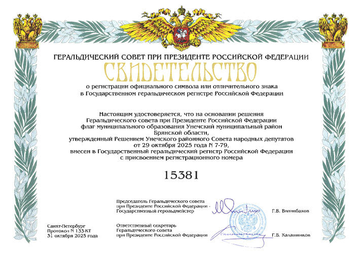 Флаг Унечского муниципального района внесён в Государственный геральдический регистр РФ под № 15381. Материалы предоставлены И. Афонасенко |