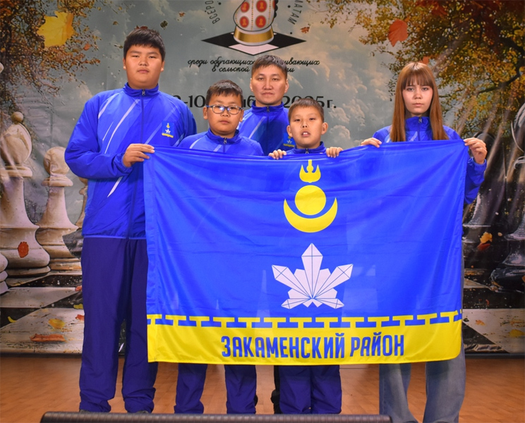 На фото вариант флага Закаменского района, дополненный поясняющей надписью. Фото прислано В. Попоски (V.Poposki), юношеская команда Закаменского района на Всероссийских соревнованиях по шахматам |