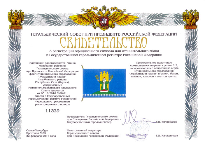Флаг внесен в Государственный геральдический регистр РФ под № 11329.