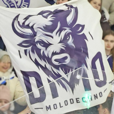 В 2010 году появился вариант эмблемы, где голова зубра помещена в синее кольцо, на котором в надписи "хоккейный клуб "Динамо-Минск" сохранена и традиционная динамовская "Д". В 2016 году курсивные надписи на синем круге вокруг головы зубра стали писать прямым шрифтом. Надпись могла воспроизводиться по--белорусски "ХАКЕЙНЫ КЛУБ ДЫНАМА-МIНСК", по-русски или по-английски. Именно такие флаги до 2019 года выносил на арену "Зубрик", талисман "Динамо". Источник - фото - "БелТА" www.belta.by |