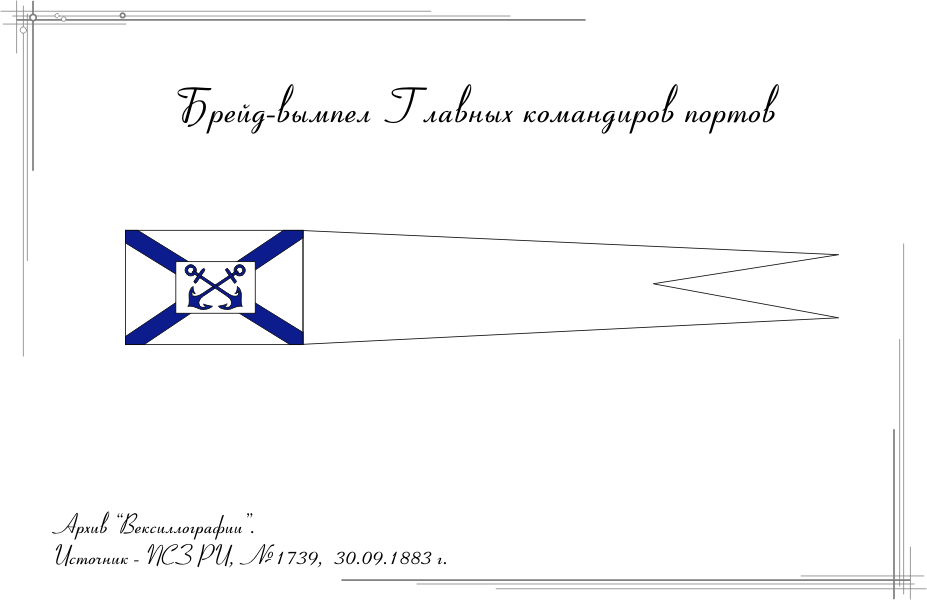 30 сентября 1883 года (ПСЗ №1739) высочайше утвержден брейд-вымпел Главных Командиров портов (к их флагу добавлены белые косицы). Брейд-вымпел поднимался на судах и шлюпках. В Своде Морских постановлений. Кн. Х, изд. 1886 г. говорилось: "1111. Флаг главных командиров портов - белый флаг с синим Андреевским крестом, имеющим по середине белый же четыреугольник, на котором расположены диагонально на крест два якоря, рымами вверх. Флаг этот только шлюпочный... Главный командир имеет право поднимать этот флаг на крыше своего дома.
