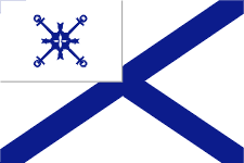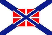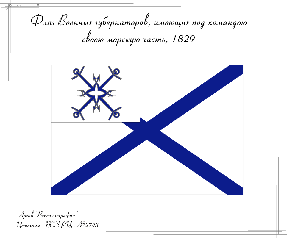 Военный губернатор, если он имел под командой морскую часть, с 18 марта 1829 года [ПСЗ РИ, № 2743, 18.03.1829 г.] и до 1865 года имел должностной флаг в виде Андреевского креста с добавлением в кантоне уменьшенного адмиралтейского флага. В Морском Уставе 1853 (со ссылкой на Высоч.повел., изъясн. в цирк. Инсп.Депар.Морск.Мин. от 7 января 1837 года) сказано, что этот флаг поднимается на катере, когда Е.И.Величество изволит быть под штандартом, кроме того, если в распоряжении военного губернатора есть яхта или другое легкое военное судно - этот флаг поднимается там, но только на своем рейде, салюта флагу не производится. Этот флаг 12 июля 1865 года (ПСЗ №42305) [приказ генерал-адмирала Константина № 98] был переведен из стеньговых в шлюпочные, а на стеньгах стало возможным поднимать только положенный по чину адмиральский флаг. В 1870 году флаг губернатора был присвоен генералам военно-сухопутной службы, имеющим под командой военно-морскую часть. Использован текст Полного собрания законов Российской империи и консультации А.Н.Басова (г.Минск) |
