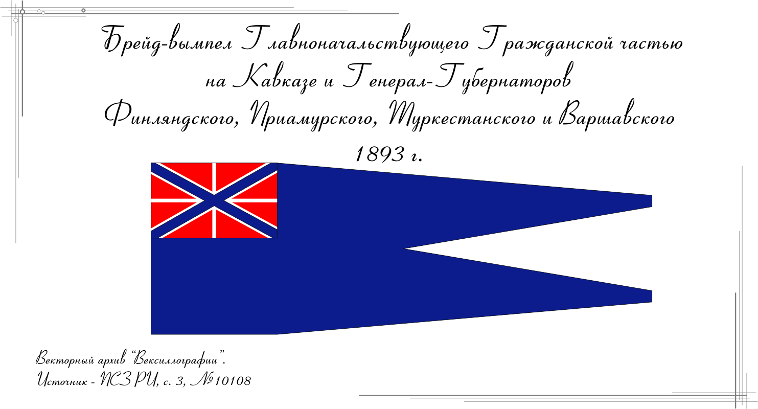 29 ноября 1893 года (ПСЗ РИ, №10108) флаг Гравноначальствующего гражданской частью на Кавказе и Генерал-губернаторов Финляндского, Приамурского и Туркестанского заменен брейд-вымпелом. Брейд-вымпел поднимался на грот-брам-стеньге военных судов, на судах военного ведомства, на носовом флагштоке шлюпок в прибрежных водах. Тогда же такой же брейд-вымпел пожалован и Варшавскому генерал-губернатору. . В ПСЗ РИ рисунок вымпела нецветной... Но синий цвет этого брейд-вымпела с кайзер-флагом в крыже подтвержден другими изданиями (напр. "Drawings of the flags in use at the present time by various nations" Британского Адмиралтейства, 1916 г; приказ по военному ведомству № 41 1894 г.). Использован текст Полного собрания законов Российской империи и консультации А.Н.Басова (г.Минск) |