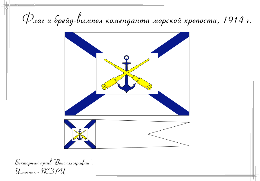 23 cентября 1913 года законом №40282 были утверждены флаг и брейд-вымпел коменданта морской крепости. Флаг - "белый с синим Андреевским крестом, имеющий посередине белый четырехугольник, на котором расположены диагонально накрест две пушки жёлтого цвета, дулами вверх, и посредине синий якорь в вертикальном положении, рымом вверх". Флаг шлюпочный. Этим флагом пользовались коменданты Свеаборга, Выборга, Кронштадта, Усть-Двинска, Очакова, Севастополя, Керчи, Михайловской, Владивостока, Николаевска-на-Амуре и Трапезунда. Коменданты крепостей поднимали такой флаг на своем доме.