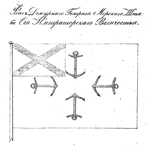 Приказом по Морскому ведомству от 5 марта 1912 года (высоч. утв. 5 марта 1912 г., ПСЗ РИ № 36670) введен флаг Начальника Морского Генерального Штаба. Приказом от 20 апреля 1912 года этот флаг включен в Морской Устав. Флаг белый с Андреевским крестом, в белом крыже четыре соприкасающиеся рымами якоря, расположенные прямым крестом. Флаг поднимался на кораблях на грот-мачте, на шлюпках - на носовом флагштоке. ПСЗ РИ |