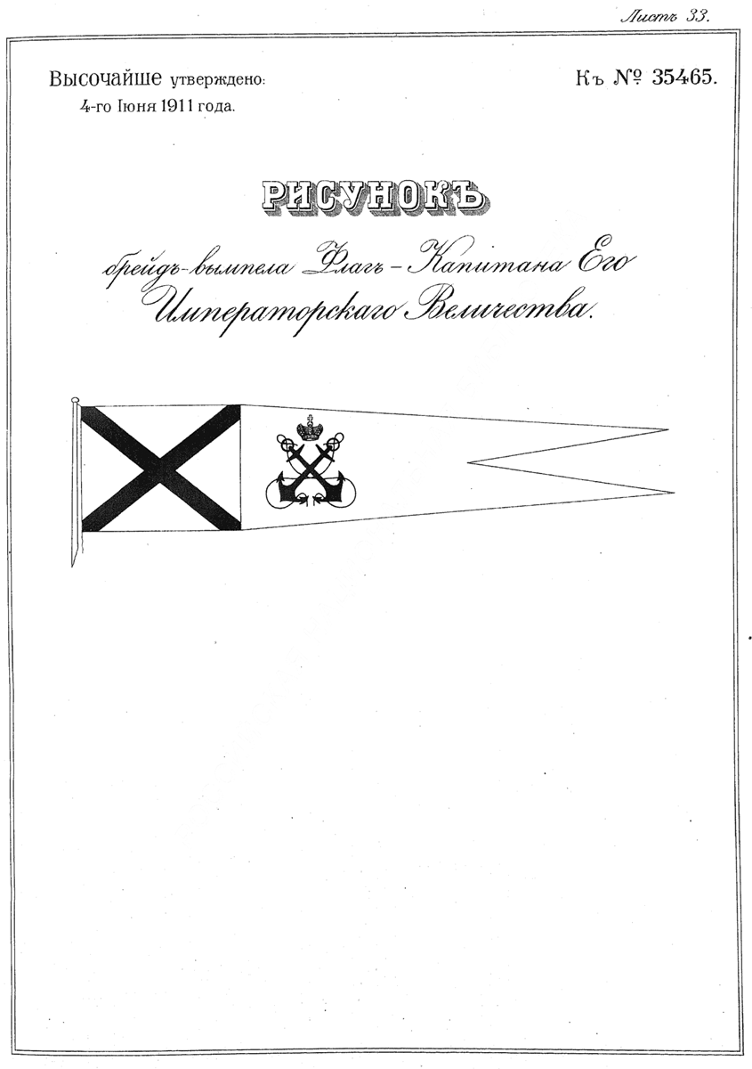 Брейд-вымпел Флаг-Капитана Его Императорского Величества установлен Высочайшим Указом от 4 июня 1911 года (ПСЗ РИ № 35465): в головке андреевский флаг, сам вымпел белый, на нём изображены два якоря накрест с канатами, а над ними императорская корона. Об этом вымпеле объявлено в приказе по Морскому ведомству 8 июля 1911 года № 207. Источники - ПСЗ РИ; Отчеты по Морскому министерству. - Петроград : Тип. Морского м-ва, 1911-1915 гг. Энциклопедия Брокгауза и Ефрона сообщает об этой должности следующее: "Флаг-капитан Его Императорского Величества начальствует на правах флагмана, отдельно командующего, над всеми императорскими яхтами, паровыми и гребными катерами Его Величества и шлюпками при загородных дворцах; сопровождает государя императора, когда Его Величество находится на императорской яхте, или на одном из военных или частных кораблей, или на катере; в последнем случае лично управляет катером". По книге В.Соколова "Флаги Российской империи и СССР в документах" |