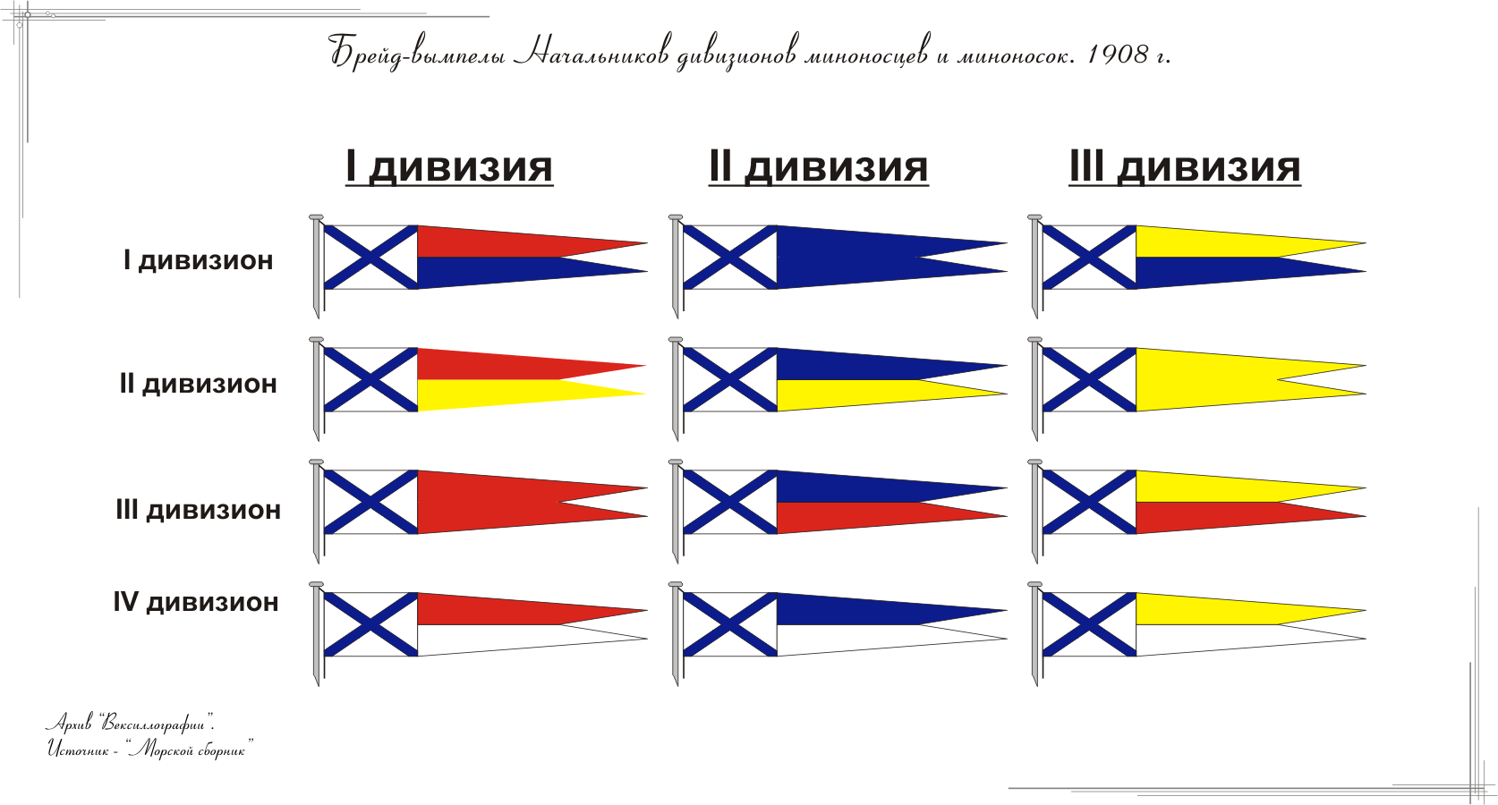 Постановлением от 24 марта 1908 года "Об установлении отличительных флагов для начальников дивизионов минных судов" (ПСЗ №30195) были введены брейд-вымпелы указанных командиров ("начальников дивизионов эскадренных миноносцев и начальников дивизионов миноносцев и миноносок" (для подъема на грот-мачте, без рейка). Документы о брейд-вымпелах начальников дивизионов миноносцев и миноносок:- Постановление Адмиралтейств-Совета утверждено 24 марта 1908 года. - Рапорт Морского министра последовал 31 марта 1908 года №131 с изъяснением Высочайшего повеления. - Указ Правительствующего сената от 15 мая 1908 года - "высочайшее повеление припечатать в установленном порядке... а Морского Министра уведомить указом". - Приказ по Морскому ведомству от №123 от 20 мая 1908 года Адмиралтейств-совет дополнил Морской Устав статьей 1323.1 "начальники