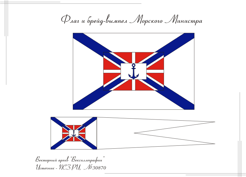 В статье 1321 Морского Устава (редакция указа от 31 июля 1908 года) описан брейд-вымпел товарища морского министра: в головке синий андреевский крест с четырьмя якорями, косицы белые (ПСЗ №30870). |