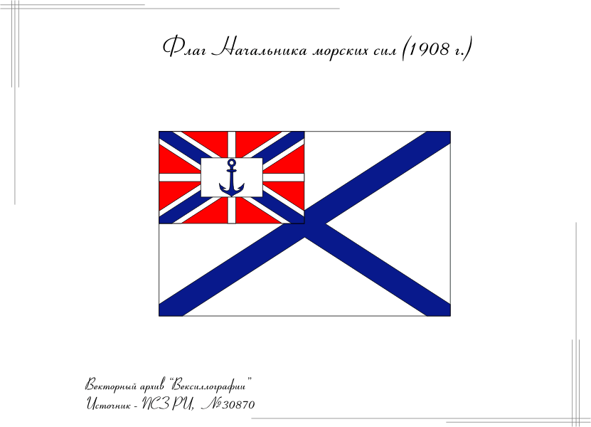 Флаг Командующего морскими силами Балтийского и Чёрного морей и Командующего Сибирской флотилией (согласно редакции Морского устава от 23.09.1913, до того этот флаг принадлежал главным командирам портов) - андреевский с белым прямоугольником в центре, в котором два накрест положенных якоря рымами вверх. Флаг поднимался только на суше: над домом Главнокомандующего, либо в порту. |