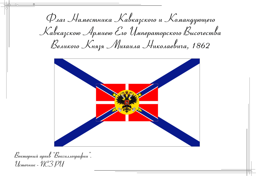 Наместник Кавказский и Командующий Кавказской армией ЕИВ Великий князь Михаил Николаевич получил флаг указом от 31 декабря 1862 года (ПСЗ №39111). Именно указ об этом объявлен в циркуляре Инспекторского Департамента Морского Министерства от 11 января 1863 года. Это был Андреевский флаг с гюйсом в середине, в центре гюйса круг с изображением орла, наложенный на два орудийных ствола. |
