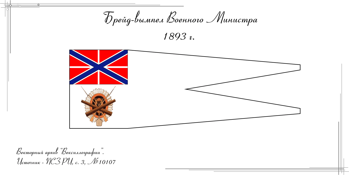 Брейд-вымпел Военного министра утвержден 29 ноября 1893 года (ПСЗ РИ, № 10107). Брейд-вымпел должен был подниматься на судах военного ведомства, а также на носовом флагштоке паровых и гребных шлюпок того же ведомства. ПСЗ РИ, 1893, № 10107 4 июня 1911 года Высочайше соизволено в случае нахождении Военного Министра на судах военного флота, поднимать на этих судах присвоенный ему брейд-вымпел. Объявлено в приказе по Морскому ведомству 8 октября 1911 года № 297 Отчеты по Морскому министерству. - Петроград : Тип. Морского м-ва, 1911-1915 гг.