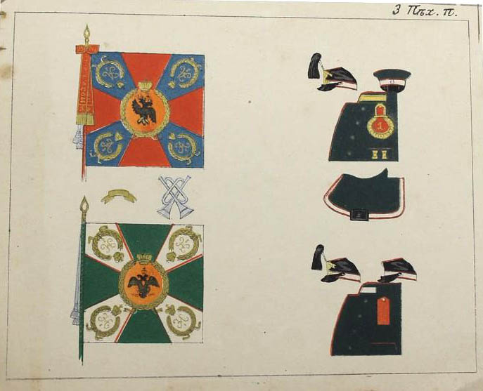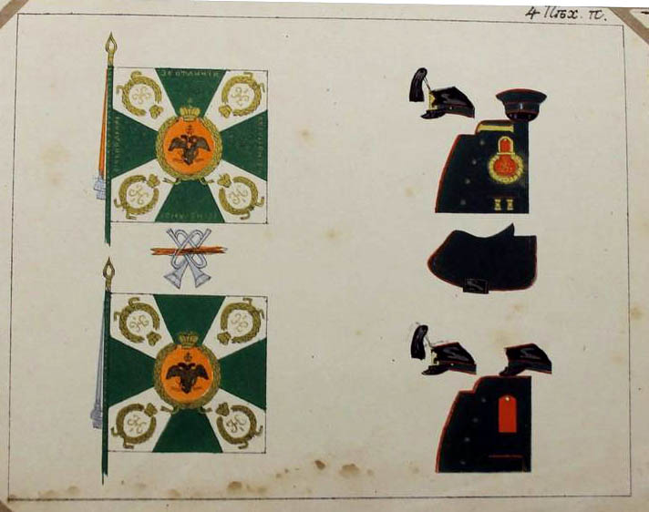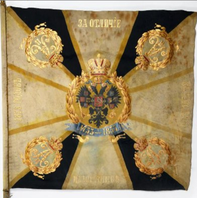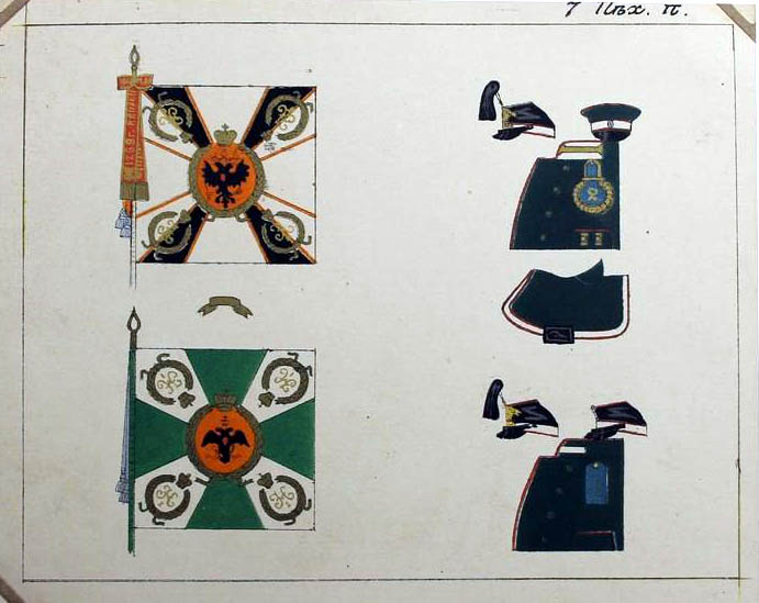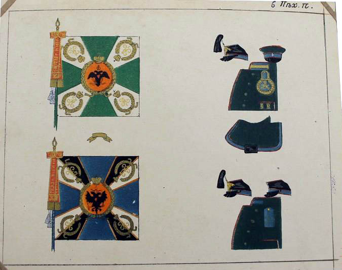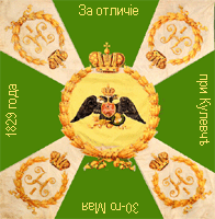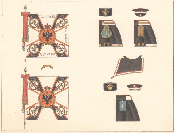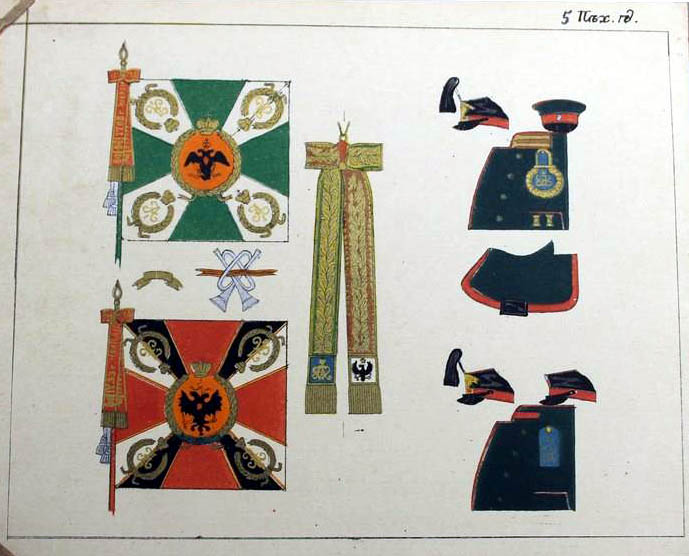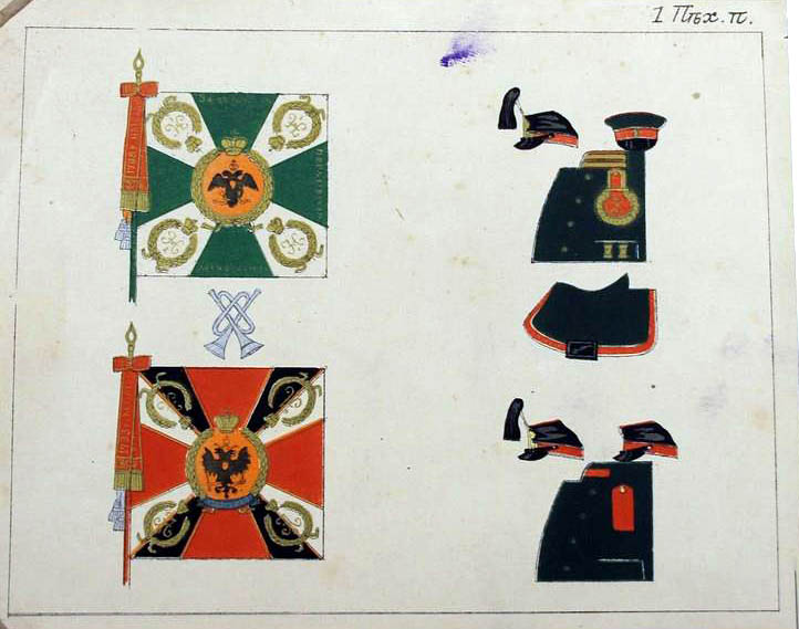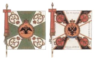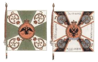 25 июня 1838 года 1-му и 2-му батальонам Александровские ленты и скобы. Знамена имели зелёный крест и белые углы (как и другие пехотные знамена тех времен), шитье золотое. По книге А.Висковатова |