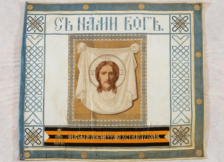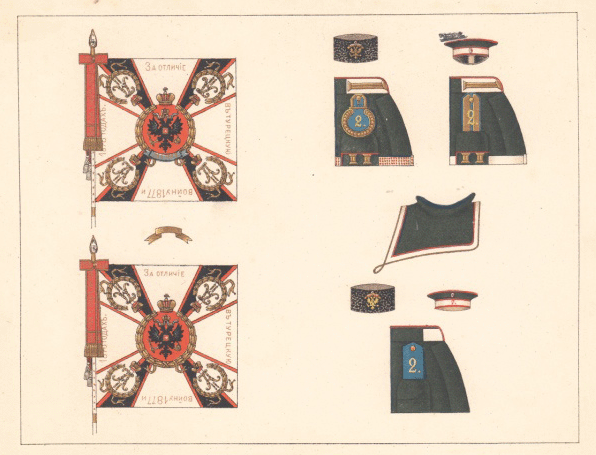 Рисунок знамен с интендантской карточки 1 Невского пехотного Короля Эллинов полка (1890е). Впрочем, возможно карточка ошибочно идентифицирована как принадлежащая 1-му полку... |