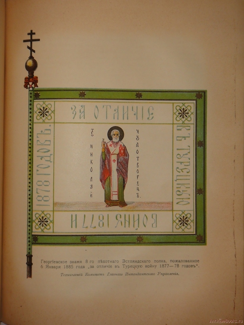 8-му Эстляндскому пехотному полку 6 января 1885 года пожаловано Георгиевское знамя (у Звегинцова стоит ремарка "без ленты") с образом Святителя Николая Чудотворца. Знамя белое, кайма знамени тёмно-зелёная. "За отличие / В турецкую / войну 1877 и / 1878 годов". Вензеля Александра III. По В. Звегинцову. Рисунок (верхняя часть) - http://www.grafika.ru/item/08-007998?q=знамя. Справа - фото интендантской карточки полка с изображением знамени. 19 февраля 1911 года 8-му пехотному Эстляндскому полку пожаловано Георгиевское юбилейное (к 200 летию полка) знамя образца 1900 года. На лицевой стороне Спас Нерукотворный. Кайма темно-зеленая. Надписи: "За отличiе въ Турецкую войну 1877 и 1878 годовъ" (на отрезке Георгиевской ленты) и "1711-1811-1911". На Александровской юбилейной ленте надписи: "1911 года" и "1711г. Ревельскаго гарнизона Ревельскiй, Эстляндскiй и Дерптскiй полки". Знамя имело Георгиевское навершие образца 1868 года и чёрное древко. По материалам работы Т.Шевякова "Знамена и штандарты Русской армии в Великой войне (рукопись)"; (см.также tarlith-history.livejournal.com) 26.07.1912 г. установлено нашить на Георгиевское знамя отрезок Георгиевской ленты с надписью отличия полка - "За отличiе въ Турецкую войну 1877 и 1878 годовъ" и подвязывать Георгиевскую ленту с кистями к трубке навершия. Историческая справка по 8-му пехотному полку на сайте "Антология форменной одежды частей Российской армии" |