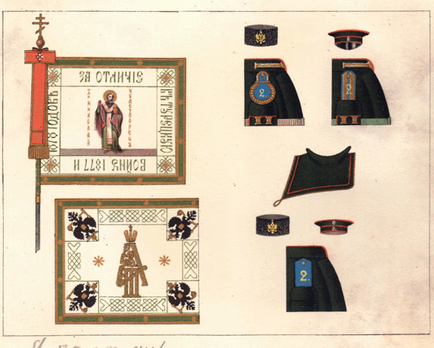 20.7.1879 года вновь сформированным 4 батальонам пехотных полков № 1-42 переданы знамёна 7-х запасных батальонов тех же полков. При этом знамя 8-го запасного батальона 2-го пехотного полка было передано в 90-й пехотный полк. По В.В.Звегинцову.