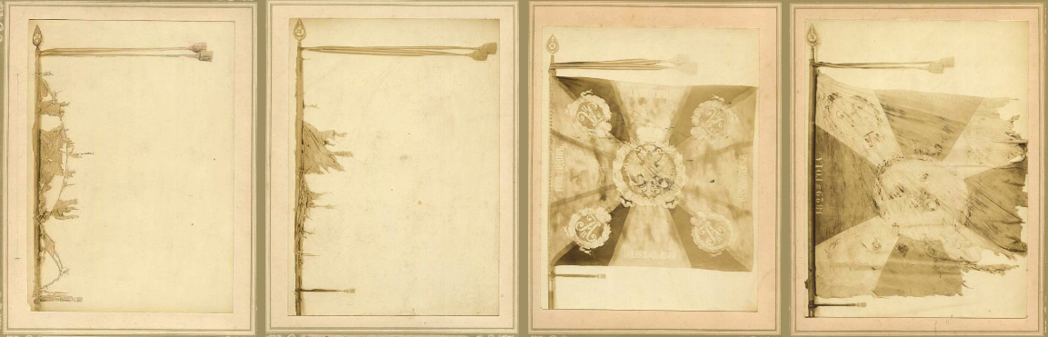 Существует серия фотографий начала ХХ века, запечатлевших знамена 1-4 батальонов Копорского полка. Судя по этим фотографиям (а батальоны там подписаны): знамена первого и второго батальона представляли из себя обрывки, третий батальон - знамя обр 1876 года, четвертый - знамя более раннего образца, на котором сохранилась цифра "1829" (видимо, от наградной надписи за Кулевчу). У всех знамен Георгиевские навершия. Фото - Госкаталог (Областное государственное бюджетное учреждение культуры "Смоленский государственный музей-заповедник") |