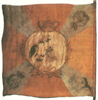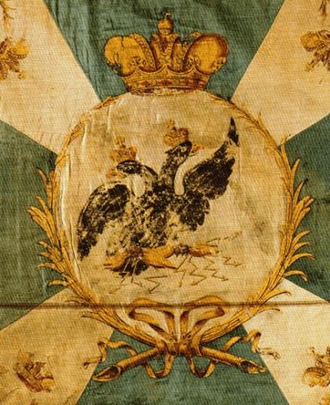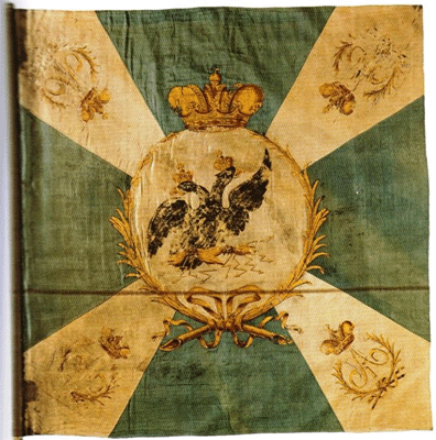Гарнизонное знамя Cофийского пехотного полка образца 1803 года предсталяло собой полотнище с зеленым крестом и белыми углами (без вензелей императора). В центре в оранжевом коронованном медальоне двуглавый орел с перунами и молниями. Использован рисунок из книги "Русская армия 1812-1814", художник О.К.Пархаев |