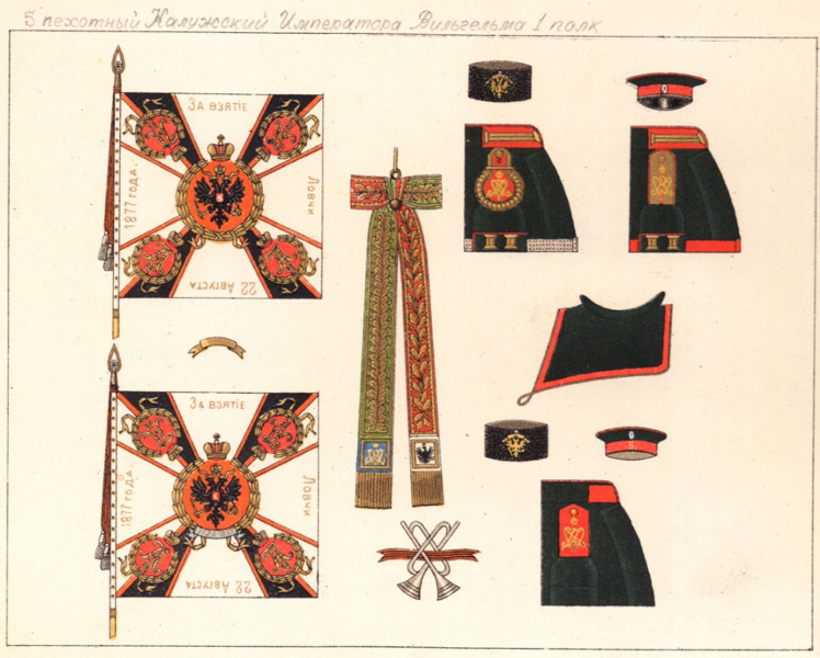 5-й Калужский пехотный полк (1805-1917) Полк сформирован в 1805 году, с 1811 г - пехотный; с 1818 года стал полком Принца Вильгельма Прусского (впоследствии короля Вильгельма I). С 1833 полк состоял из четырех действующих и двух резервных батальонов (в мирное время - один сводный резервный). В 1834 году 6-й батальон упразднен. В 1842 году 5-й резервный батальон упразднен, тогда же созданы 5-й резервный и 6-й запасный батальоны. В 1854 году созданы 7-й и 8-й запасные батальоны, а 6-й запасный переименован в 6-й резервный.