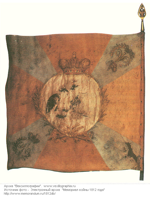 В 1810 году (по Звегинцову: по в мае 1810 г., отправлены 9.11.1810 г.) Нарвскому мушкетерскому полку пожалованы 5 цветных знамен образца 1803 года: с оранжевым крестом (по Звегинцову - крестом цвета "мордоре", т.е. золотисто-красным) и голубыми углами. Знамена даны взамен утерянных знамен 1798 года. По А.Висковатову и В. Звегинцову. Также представлена фотография сохранившегося знамени полка с сайта "Мемориал войны 1812 года" (www.memorandum.ru/1812db) - в центре. Справа - фото знамени с сайта "Мемориальный кабинет М.И.Кутузова" Сохранились сведения, что капитан Гофман и портупей-прапорщик Лысенко после поражения при Аустерлице спасли знамя шефского батальона Нарвского мушкетерского полка во французском плену, а затем передали его русскому послу в Вене. Кутузов сообщал императору о том, что 20 ноября 1805 года портупей-прапорщик Гавриленко вынес знамя полка, оторванное от древка, из боя. В январе 1806 года это знамя вновь прибили к древку. Опять же Кутузов сообщал императору 28 февраля 1806 года, что в день Аустерлицкого сражения гренадер Петр Нестеров взял знамя у убитого прапорщика, оторвал знамя от древка, сам попал в плен, но бежал. Это знамя вернулось к Кутузову, и было прибито к древку.Наконец, в рапорте генерал-майора Меллера-Закомельского сообщалось, что портупей-прапорщик Михайло Шеремецкий хранил батальонное знамя Нарвского мушкетерского полка во французском плену. По статье Г.Э.Кудлина "Аустерлицкие знамена" // журн."Адьютант" |