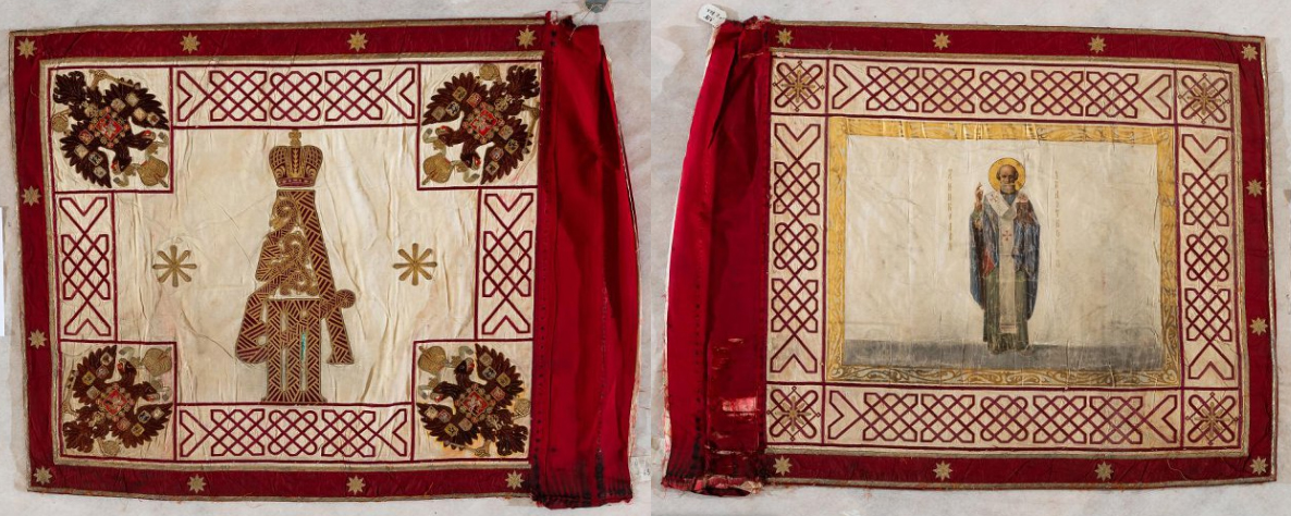 У В. Звегинцова не говорится о знамени 1800 года, а напротив, говорится, что полку передано знамя 1-го резервного пехотного батальона (пожал. 18.3.1880 г., медальоны красные). После 1 рез. пех. батальона это знамя использовалось Александро-Невским резервным батальоном. Та же Александр. лента продолжала использоваться до 1917 года. |