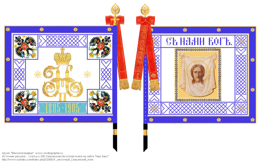 14 июня 1905 года полку даровано юбилейное знамя образца 1900 года. Кайма светло-синяя, шитье золотое. Знамя имело навершие образца.1857 года, древко чёрное. На лицевой стороне знамени изображение Спаса Нерукотворного. На оборотной стороне даты "1805-1905". На Александровской юбилейной ленте надписи: "1905 ГОДА" и "1805 г. КАСПIЙСКIЙ МОРСКОЙ БАТАЛIОНЪ". По материалам работы Т.Шевякова "Знамена и штандарты Русской армии в Великой войне (рукопись)"; (см.также tarlith-history.livejournal.com). Увеличенный рисунок воспоизводится по иллюстрации к статье о Сальянском полке на сайте "Наш Баку" |
