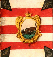 В 1712 году для Белгородского пехотного полка было изготовлены: белое знамя с вензелем Петра Великого в венке, и "цветные" (ротные) знамена с изображением бегущего золотого льва и, над ним, орла. Знамя чёрно-зелёное, крест из зелёных и синих полос, в середине - золотая четырехконечная звезда. Использована информация и иллюстрация (с небольшими изменениями) с сайта В.Лобачева "ГЕРБ.БЕЛ.РУ. Гербы и символы Белгородской области" |