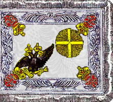 В 1807 году (пожалованы 13.06.1806 г.) Черниговскому драгунскому полку выданы 1 белый и 4 зеленых штандарта образца 1803 года, дополненные надписью: “За подвигъ при Шенграбене, 4 Ноября 1805 года, въ сраженiи 5 т. корпуса съ непрiятелемъ, состоявшимъ изъ 30 т.”. По А.Висковатову. Рисунок взят с сайта http://antologifo.narod.ru/ |