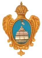 В 1730 году утверждён герб для знамен Кроншлотского гарнизонного полка: в золотом щите на голубом поле белый Кроншлотский замок с золотою короною и флагом. По А.Висковатову, использован рисунок герба из книги "Гербовник знамен Российской империи, содержащий рисунки гербов городов, провинций, а также знамен полков, их гербов и знаков" (на сайте Президентской библиотеки им. Б.Н.Ельцина) |
