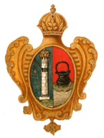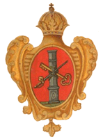 В 1730 году утверждён герб для знамен Кронштадтского гарнизонного полка: в золотом щите на двойном поле, в левой, голубой, половине белая высокая караульная башня с фонарем и золотою короною; в правой, красной, на зелёной земле подле воды чёрный котел. По А.Висковатову, использован рисунок герба из книги "Гербовник знамен Российской империи, содержащий рисунки гербов городов, провинций, а также знамен полков, их гербов и знаков" (на сайте Президентской библиотеки им. Б.Н.Ельцина) |