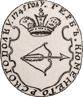 В 1730 году утверждён герб для знамен Коротояцкого гарнизонного полка: в золотом щите, на голубом поле красного цвета магазин, стоящий при реке, и над ним рог изобилия. По А.Висковатову, рисунок подготовлен для "Вексиллографии" Ю.Калинкиным |