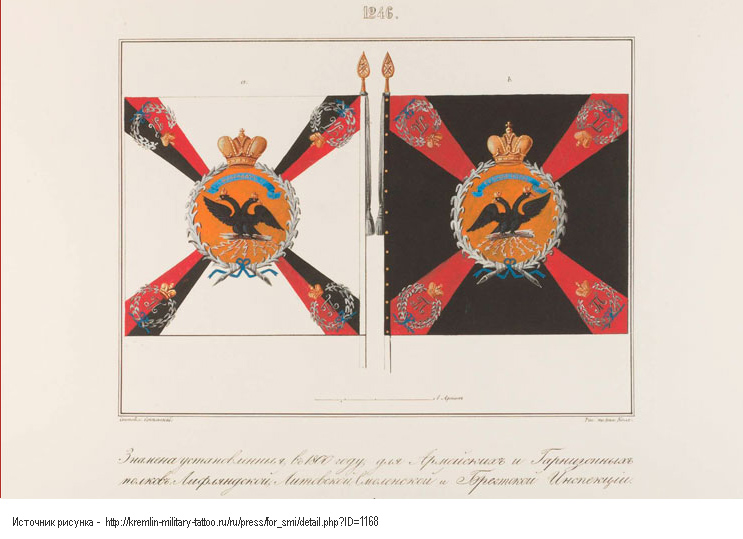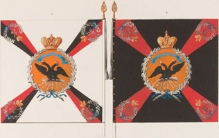 В Санкт-Петербургской инспекции для цветных пехотных знамён образца 1803 года установлены такие цвета: крест чёрный, углы красные. По В. Звегинцову |