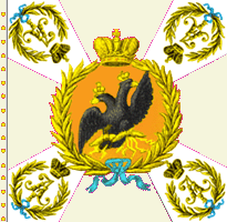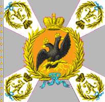 В 1800 году для гренадерских, мушкетерских и гарнизонных полков установлены знамена новой формы. Центральный медальон оранжевого цвета окружен лавровым венком и увенчан короной, внутри - метающий молнии двуглавый орёл. Под орлом надписи: с одной стороны " У полков Кавказской инспекции одно знамя было с белым крестом, углами - жёлтыми с белым пополам; остальные знамена с жёлтым крестом, поверх которого белый крест, углы белые. В углах вензеля Павла I в лавровых венках. Венки вокруг оранжевого круга, венки и вензеля по углам, в Кавказской инспекции были ЗОЛОТЫМИ. По А.Висковатову. Справа - рисунок из Военной энциклопедии Сытина, 1911 |