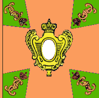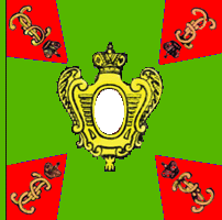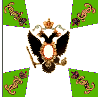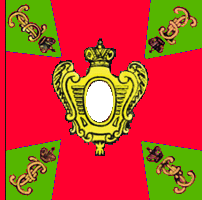 В 1800 году для гренадерских, мушкетерских и гарнизонных полков установлены знамена новой формы. Центральный медальон оранжевого цвета окружен лавровым венком и увенчан короной, внутри - метающий молнии двуглавый орёл. Под орлом надписи: с одной стороны " У полков Сибирской инспекции одно знамя было с белым крестом, углами - зеленые с жёлтым пополам; остальные знамена с зелёным крестом, углы жёлтые. В углах вензеля Павла I в лавровых венках. Венки вокруг оранжевого круга, венки и вензеля по углам, в Сибирской инспекции были ЗОЛОТЫМИ. По А.Висковатову. Справа - рисунок из Военной энциклопедии Сытина, 1911 г. |