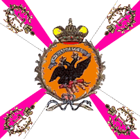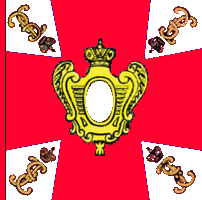 В 1800 году для гренадерских, мушкетерских и гарнизонных полков установлены знамена новой формы. Центральный медальон оранжевого цвета окружен лавровым венком и увенчан короной, внутри - метающий молнии двуглавый орёл. Под орлом надписи: с одной стороны " У полков Санкт-Петербургской инспекции одно знамя было с белым крестом, углами - малиновыми с белым пополам; остальные знамена с малиновым крестом, поверх которого белый крест, углы белые. В углах серебряные вензеля Павла I в лавровых венках. По А.Висковатову. Справа - рисунок из Военной энциклопедии Сытина, 1911 |