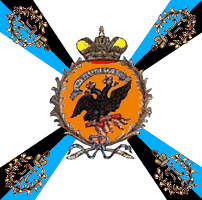В 1800 году для гренадерских, мушкетерских и гарнизонных полков установлены знамена новой формы. Центральный медальон оранжевого цвета окружен лавровым венком и увенчан короной, внутри - метающий молнии двуглавый орёл. Под орлом надписи: с одной стороны " У полков Украинской инспекции одно знамя было с белым крестом, углами - жёлтыми с белым пополам; остальные знамена с жёлтым крестом, поверх которого белый крест, углы белые. В углах серебряные вензеля Павла I в лавровых венках. У Смоленского полка Украинской инспекции в центральном медальоне была дополнительная надпись отличия на голубой ленте. По А.Висковатову. Справа - рисунок из Военной энциклопедии Сытина, 1911 г. |