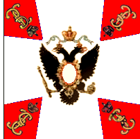 В 1800 году для гренадерских, мушкетерских и гарнизонных полков установлены знамена новой формы. Центральный медальон оранжевого цвета окружен лавровым венком и увенчан короной, внутри - метающий молнии двуглавый орёл. Под орлом надписи: с одной стороны " У полков Днестровской инспекции одно знамя было с белым крестом, углами - жёлтыми с белым пополам; остальные знамена с жёлтым крестом, поверх которого белый крест, углы белые. В углах вензеля Павла I в лавровых венках. Венки вокруг оранжевого круга, венки и вензеля по углам, в Днестровской инспекции были ЗОЛОТЫМИ. По А.Висковатову. Справа - рисунок из Военной энциклопедии Сытина, 1911 г. |
