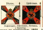 В Смоленской инспекции и для белых и для цветных пехотных знамён образца 1803 года установлены такие цвета: крест белый, углы белые. Но ни одного такого знамени выдано не было. По В. Звегинцову |