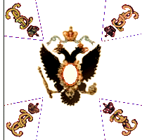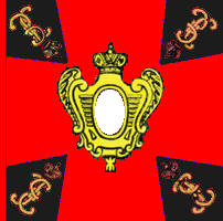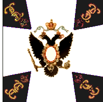 В 1800 году для гренадерских, мушкетерских и гарнизонных полков установлены знамена новой формы. Центральный медальон оранжевого цвета окружен лавровым венком и увенчан короной, внутри - метающий молнии двуглавый орёл. Под орлом надписи: с одной стороны " У полков Лифляндской инспекции одно знамя было с белым крестом, углами - черными с красным пополам; остальные знамена с чёрным крестом, углы красные. В углах серебряные вензеля Павла I в лавровых венках. Венки вокруг оранжевого круга, венки и вензеля по углам, в Лифляндской инспекции были СЕРЕБРЯНЫМИ. Таврическому гренадерскому полку дано такое же знамя, но с дополнительной надписью отличия. По А.Висковатову. Цветной рисунок взят с сайта http://kremlin-military-tattoo.ru/. Справа - рисунок из Военной энциклопедии Сытина, 1911 г. |