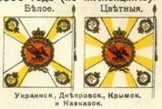 19 апреля 1764 года установлены цвета знамен для Украинской дивизии - полотнище красное, наугольники белые. Кроме цветных в каждом полку полагалось одно белое знамя с наугольниками того же цвета, что у цветных знамен. |