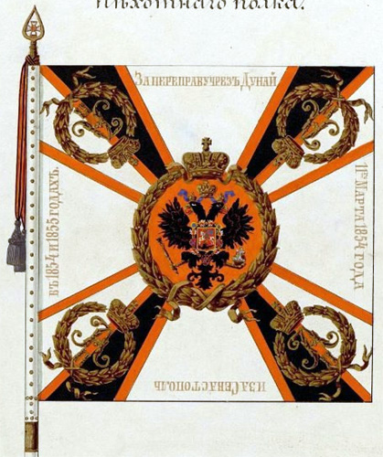 См. "Роспись знамен, штандартов и особых отличий в войсках состоящих", СПб, 1851 г. Модлинский пехотный полк имел наградное Георгиевское знамя за Севастополь 1854-1856. Использована информация сайта http://warraritets.boom.ru