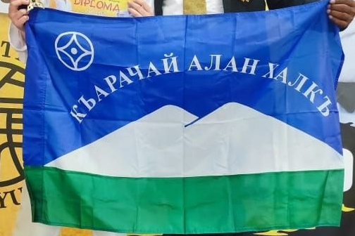 Свой флаг имеется у общенациональной общественной организации карачаевского народа "Къарачай - Алан Халкъ". На флаге изображен белый двуглавый Эльбрус, на синем поле "текмет" и название организации. Фото присланы В. Попоски |