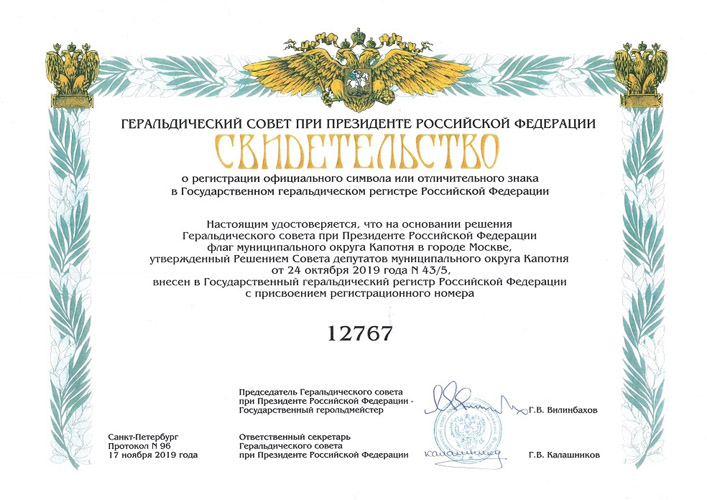 Флаг внесен в Государственный геральдический регистр РФ под № 12767 и в Геральдический реестр города Москвы МС № 36/2. Фото свидетельств с официального сайта муниципального округа Капотня |